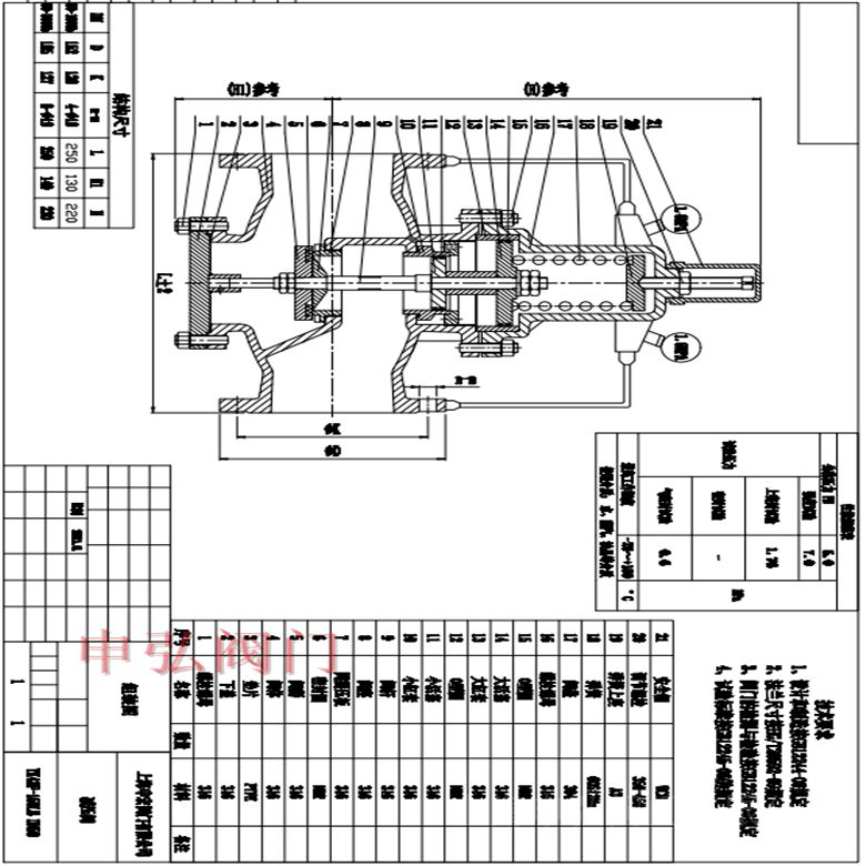 主要技术参数和性能指标 公称压力(Mpa) 1.6 2.5 4.0 6.4 10.0 16.0 壳体试验压力(Mpa)* 2.4 3.75 6.0 9.6 15.0 24 密封试验压力(Mpa) 1.6 2.5 4.0 6.4 10.0 16.0 *高进口压力(Mpa) 1.6 2.5 4.0 6.4 10.0 16.0 出口压力范围(Mpa) 0.1-1.0 0.1-1.6 0.1-2.5 0.5-3.5 0.5-3.5 0.5-4.5 压力特性偏差(Mpa)△P2P GB12246-1989 流量特性偏差(Mpa)P2G GB12246-1989 *小压差(Mpa) 0.15 0.15 0.2 0.4 0.8 1.0 渗漏量 X/F(聚四氟乙稀/橡胶):O Y(硬密封):GB12245-1989 *:壳体试验不包括膜片、顶盖 主要零件材料 零件名称 零件材料 阀体 阀盖 底盖 WCB/FCB* 阀座 阀盘 2Cr13/304* 缸套 2Cr13/25(镀硬铬)/304* 活塞 2Cr13/铜合金/铜合金* 活塞环 合金铸铁/对位聚苯* 导阀座 导阀杆 2Cr13/304* 膜片 1Cr18Ni9Ti 主阀 导阀弹簧 50CrVA 调节弹簧 60Si2Mn 密封垫(X/F型号) 橡胶/聚四氟乙稀 导阀体 导阀盖 25/304* 流量系数(Cv) DN 15 20 25 32 40 50 65 80 100 125 150 200 250 300 350 400 500 Cv 1 2.5 4 6.5 9 16 25 36 64 100 140 250 400 570 780 1020 1500 YK43F先导活塞式空气减压阀设计规范
