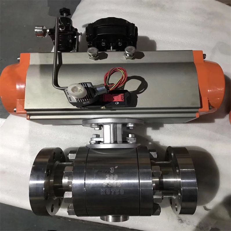 气动高压球阀由法兰/内螺纹锻造高压球阀与气动执行器组成,阀体材质均经过硬质及防腐处理,提高了阀体的强度,具有极好的耐压耐磨的优点。气动高压球阀采用三段式阀体,使结构更加紧凑且便于装配,适用于液压油,水,高压气体等介质。可配以阀门定位器输入4-20mA的模拟信号从而控制球芯运转的开度大小,实现对介质压力、流量、温度等参数的比例式调节。