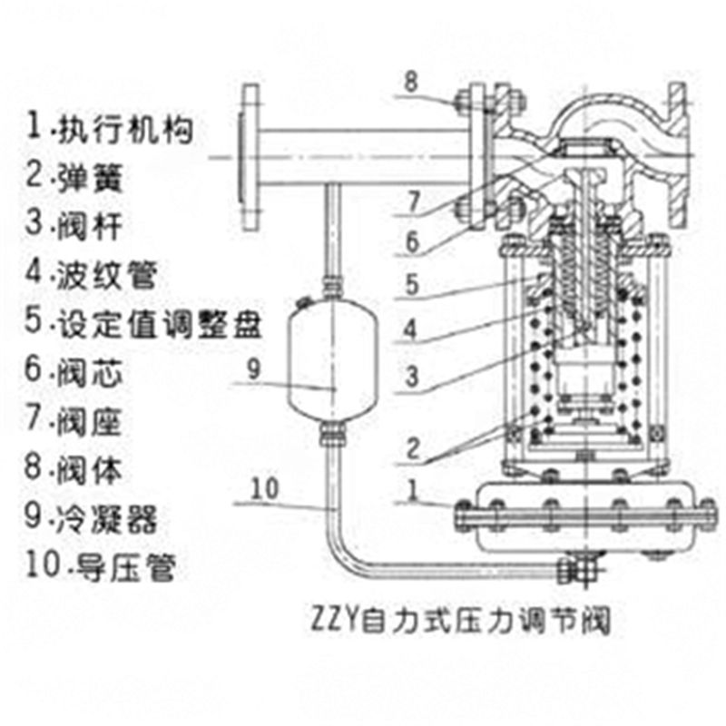 现有的自力式减压阀,在对于蒸汽介质的降温散热上不尽如人意,这方面的缺陷使阀门执行机构的使用寿命及密封效果大幅降低,影响工业生产过程的正常运行。需外加能源,利用被调介质自身能量为动力源引入执行机构控制阀芯位置,改变两端的压差和流量,使阀前(或阀后)压力稳定。具有动作灵敏,密封性好,压力设定点波动力小等优点,广泛应用于气体、液体及蒸汽介质减压稳压或泄压稳压的自动控制。