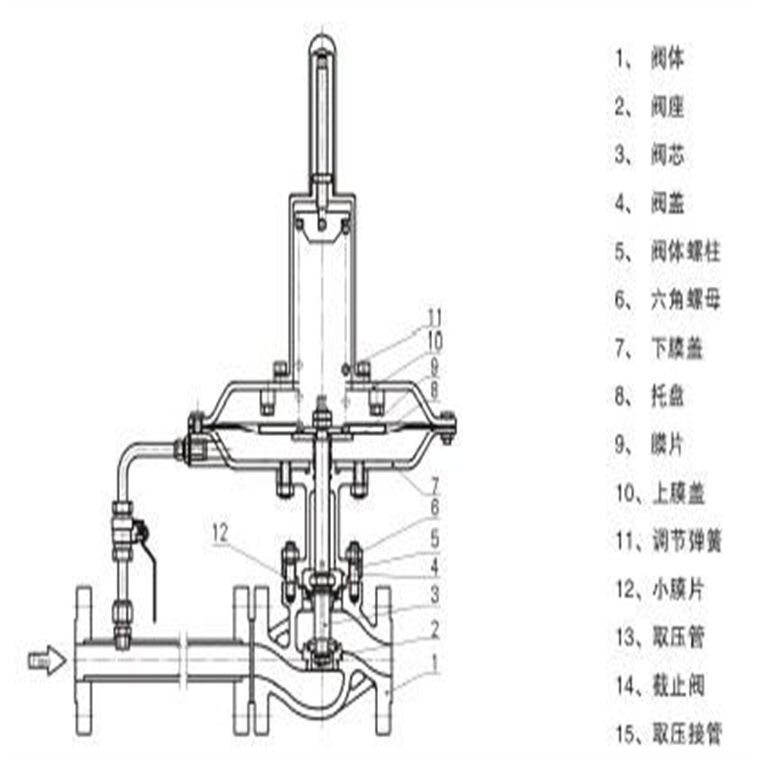 控制阀后压力的调压阀,其初始位置的阀芯在开启位置,当设定点压力升高,阀开度逐渐减小,直至阀后压力稳定在要求的给定值。