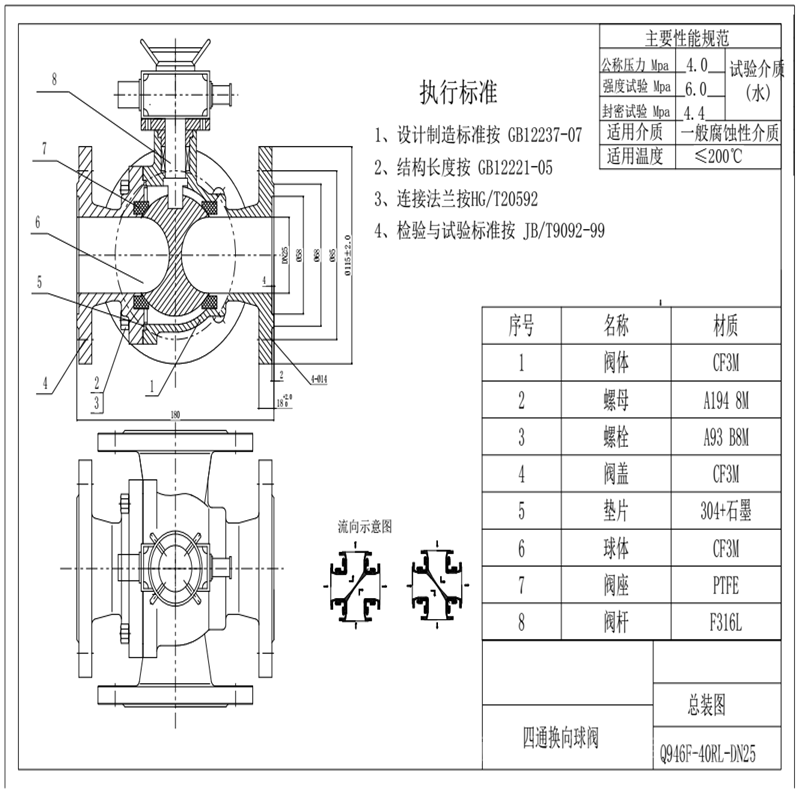 Q946F电动四通球阀主要零件材质Main Patrs and Materials: