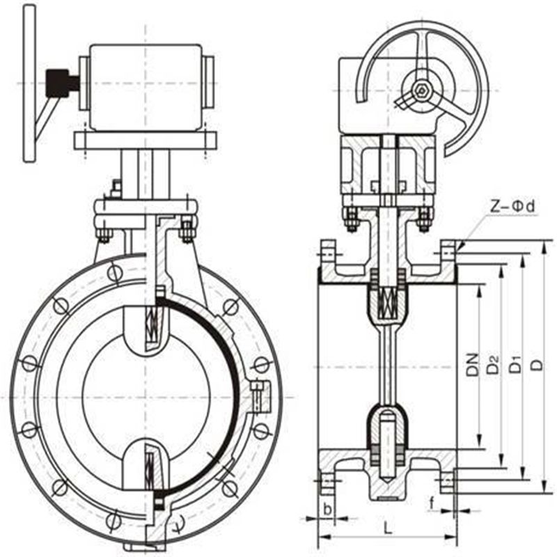 常用的蝶阀有对夹式蝶阀和法兰式蝶阀两种。对夹式蝶阀是用双头螺栓将阀门连接在两管道法兰之间,法兰式蝶阀是阀门上带有法兰,用螺栓将阀门上两端法兰连接在管道法兰上。