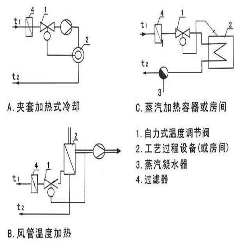 自力式温控阀的阀体安装于一次侧热媒入口处附件,感温探头安装于二次侧出口处附近。