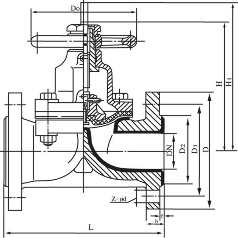 本衬里隔膜阀结构为屋脊式,其启闭件由钢质阀瓣与橡胶衬垫及氟塑料隔膜组成,并将阀体内腔与阀盖内腔隔开,以达到截断与接通介质的目的。将阀体下部内腔与阀盖内腔隔开,并与之形成直流通道,使隔膜上部的阀杆、阀瓣等内件与介质完全隔离,省去填料密封结构,介质的内漏和外漏可同时避免。表面均匀包覆一层FEP。阀体通道内表面光滑,流体阻力小,CV值高,流通能力强,扭矩适中,采用四级密封结构并在密封面外配以耐温抗老化的SI橡胶的弹性衬垫阀座,完全达到介质的零泄漏。