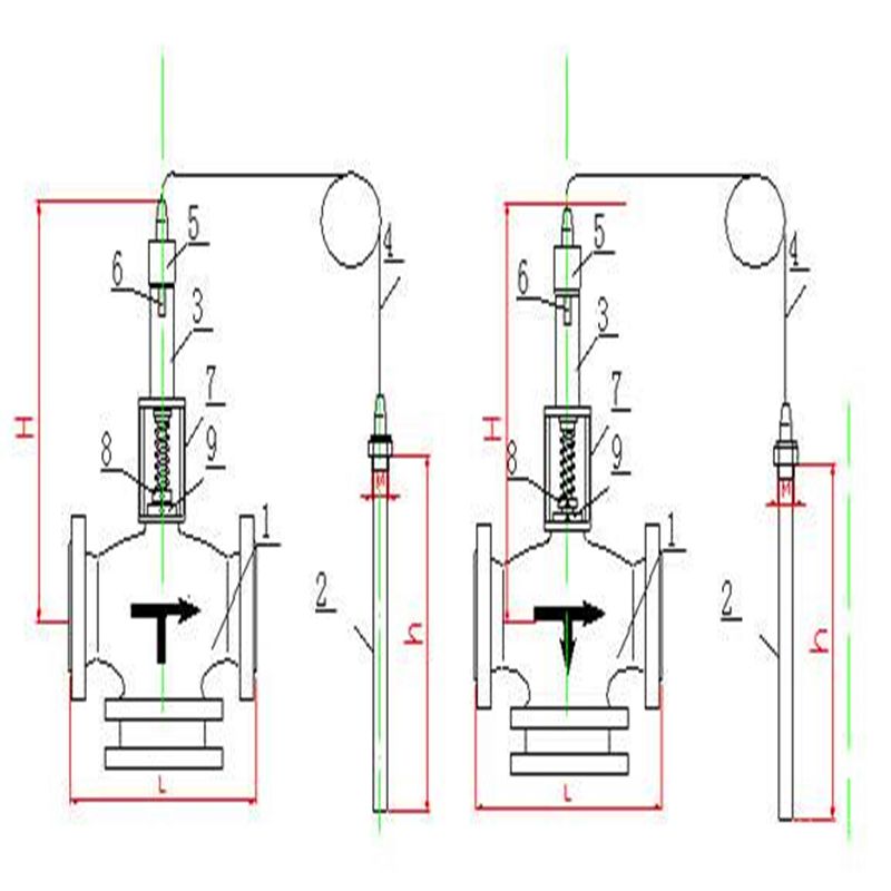 三通合流温度调节阀、三通分流温度调节阀。不同用途的自力式温度控制阀的工作原理大体相同,都是利用感温液体受热膨胀、遇冷收缩及液体不可压缩的原理进行调节。下面以加热用温度调节阀为例,结合工作原理示意图说明其工作过程:将温度传感器插入被控介质中,当被控介质温度升高时,感温液体膨胀,作用力克服弹簧阻力,推动阀芯向下移动,阀门趋于关闭,从而减少热媒介质流量;反之,当被控介质温度低于设定值时,感温液体收缩,弹簧复位推动阀芯开启,增加热媒介质流量,使被控介质温度趋于升高。循环往复,从而使被控介质温度始终保持在设定温度值的允许范围内。订货须知: