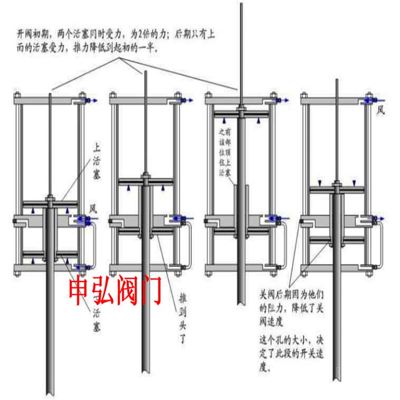 压缩空气作用在活塞或隔膜上,克服阀门动作的摩擦力和阀杆上的弹簧弹力,从而压下(对于失气开阀门)或提起(对于失气关阀门)阀杆,带动阀芯上下动作,使阀门打开或关闭。在阀门失气,驱动头内无压缩空气时,阀门会按照系统的要求处于全开或全关的安全位置。电厂用仪用压缩空气,供气压力一般为4~9bar,在进入到阀门之前,首先通过过滤器将压缩空气过滤、净化,然后通过减压阀减压,入口压力表的读数不超过4bar。压力调整是能通过调节安装在减压阀顶部的调节螺钉来实现的,调节前要先拧松保护盖。*为常见和应用*广泛的气动截止阀门四种类型是:手轮的失气关闭阀门、手轮的失气开启阀门、无手轮的失气关闭阀门、无手轮的失气开启阀门。气动截止阀门广泛用于常规对于现场用气动阀,为了防止气源失去时,自动不可操作,都设有手动操作机构。在正常运行时,手动机构被锁定在不影响阀门正常动作的安全位置(习惯称之为“中性点”),以便在主控室或操作室远程控制。在紧急情况下,即气动回路故障,气源失去或其它原因引起的气动伺服机动作而带来的远程操作失效,可由操作人员使用手动机构将阀门从安全位置反向打开或关闭,达到控制阀门开关的目的,也可以根据系统需要将阀门固定在所需的开关位置。