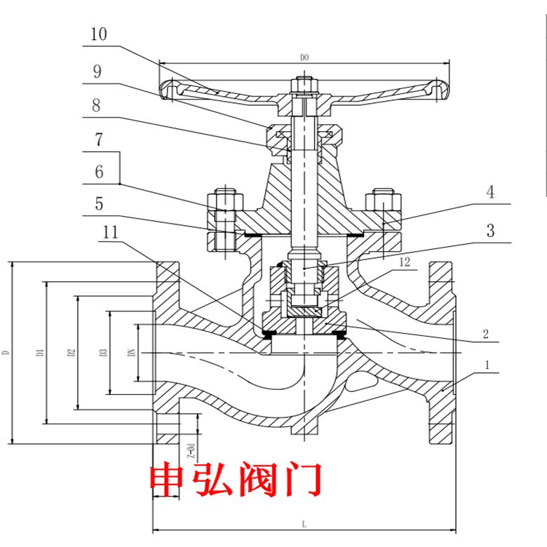 1在关闭位置,法兰截止阀阀体受阀杆的机械施压作用,紧压在阀座上。