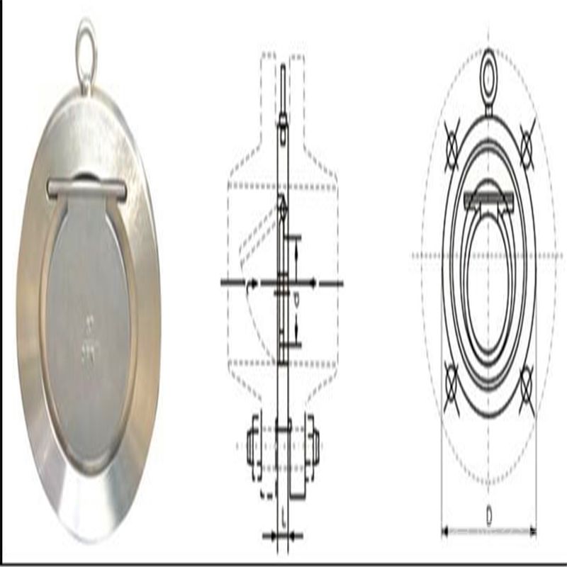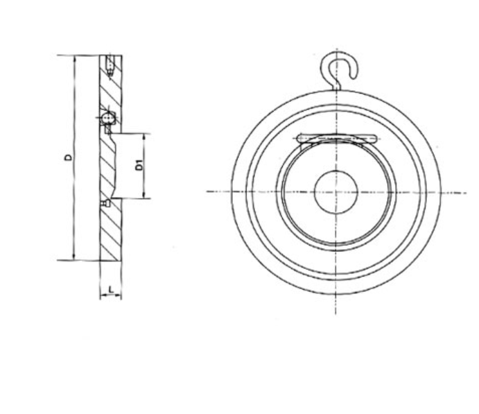 DN(mm)L D1 D PN1.0、1.6MPa PN2.5、4.0MPa 1.0MPa 1.6MPa 2.5MPa 4.0MPa 50 19 19 25 109 109 109 109 65 19 19 38 129 29 129 129 80 19 19 46 144 144 144 144 100 19 19 71.5 164 164 170 170 125 19 19 95 194 194 196 196 150 19 29 114 220 220 226 226 200 29 29 140 275 275 286 293 250 29 38 188 330 331 343 355 300 38 51 216 380 386 403 420 350 44 51 263 440 446 460 477 400 51 51 305 491 495 517 549 450 60 76 356 541 558 567 574 500 64 83 406 596 620 622 626 600 70 90 482 698 732 734 745 700 80 90 562 813 804 831 - 800 90 100 464 918 912 942 - 900 90 100 738 1018 1012 1040 - 1000 100 120 846 1124 1126 1155 - 与现有的技术相比,本实用新型具有以下突出优点和效果:由于设有以上结构,该对夹式止回阀实现单向控制的可靠性高和灵敏性高,而且能过滤介质中的硬杂质,从而降低密封面的磨损,延长止回阀的使用寿命。是能自动阻止流体倒流的阀门。止回阀的阀瓣在流体压力作用下开启,流体从进口侧流向出口侧。当进口侧压力低于出口侧时,阀瓣在流体压差、本身重力等因素作用下自动关闭以防止流体倒流。