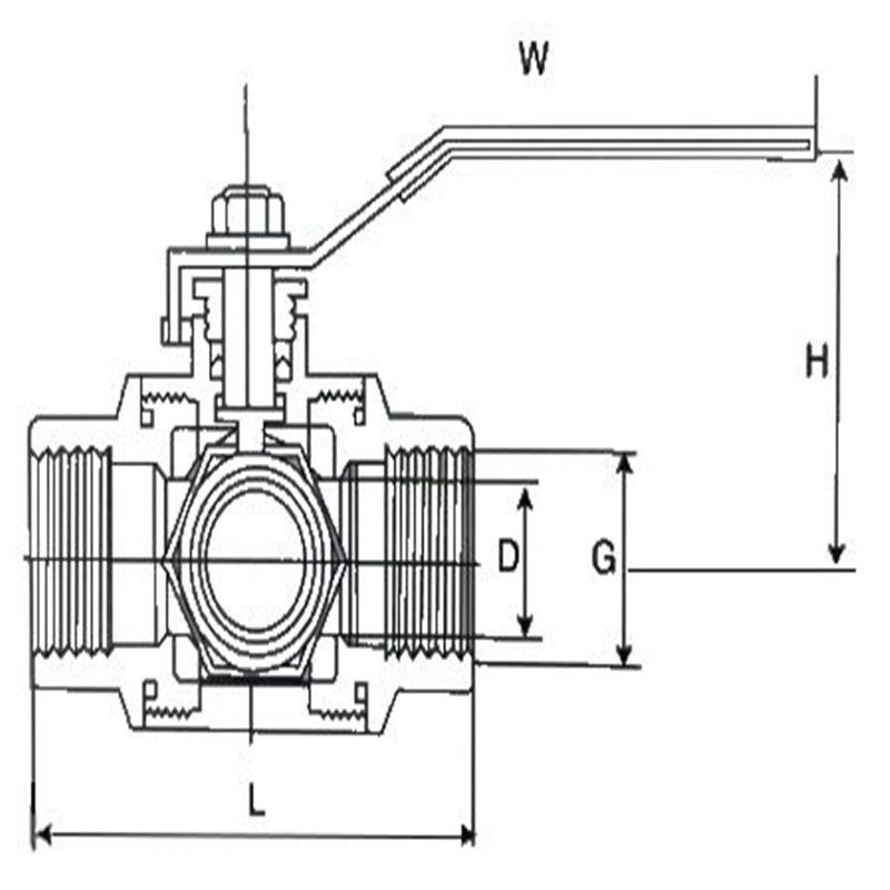 阀体形式 三通铸造球型阀 公称通径 DN15~50mm 公称压力 PN1.6、2.5、4.0、6.4 MPa 连接形式 螺纹式(适用于1/2"~2") 压盖型式 螺母旋紧式 密封填料 V型聚四氟乙烯填料、PPL高温密封材料 ● 阀内件