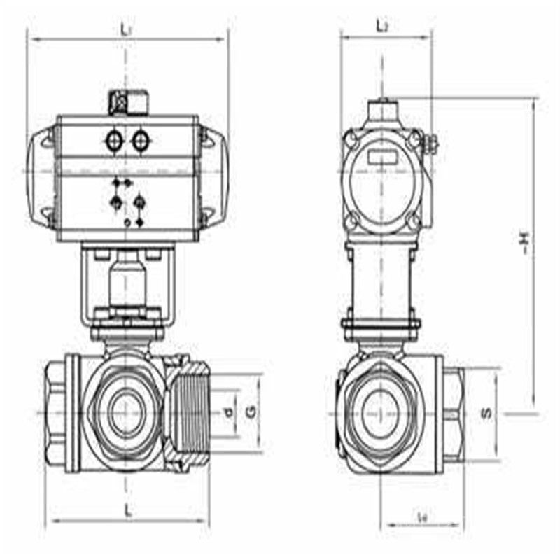 (1)气动三通内螺纹球阀有两座和四座密封结构,阀芯孔道有L型和T型两种结构形式,采用控制阀芯旋转角度,改变阀芯孔道与管道口的连接状态,可实现对三条支管不同的组合控制。气动三通内螺纹球阀流通能力大,可控制气体、液体、蒸汽,更适用于控制高粘度,纤维颗粒状的流体。也适用于密封要求较严格的场合。