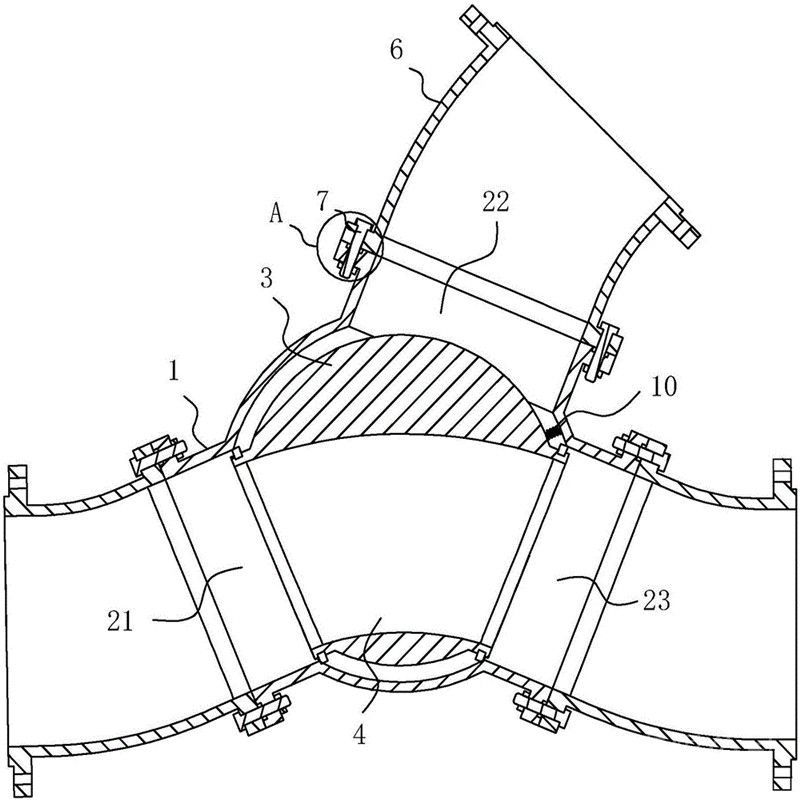 本实用新型涉及三通阀门领域,特别涉及一种三通球阀。本实用新型公开了一种Y型三通球阀,包括阀体,阀体中设有阀芯以及具有三个管口的流体通道,阀芯内设有两端开口的连接通道,阀体上的任意两个管口随着阀芯的转动实现与连接通道的导通或关闭,连接通道的任意径向截面都为与管口内径一致的圆,连接通道的两端开口径向截面的法向夹角大于90°,流体通道的三个开口处设有阀座,阀座的通孔构成管口,阀座朝向阀芯的一端与阀芯的外周面之间设有压紧块,压紧块朝向阀芯的侧面具有与阀芯外周面的弧面配合的抵接面,压紧块的另一侧与阀座之间设有内密封结构.本实用新型可以实现三种不同的流向切换,且密封结构牢固耐用使用寿命长,流体流动阻力小,便于三通管道的清理.