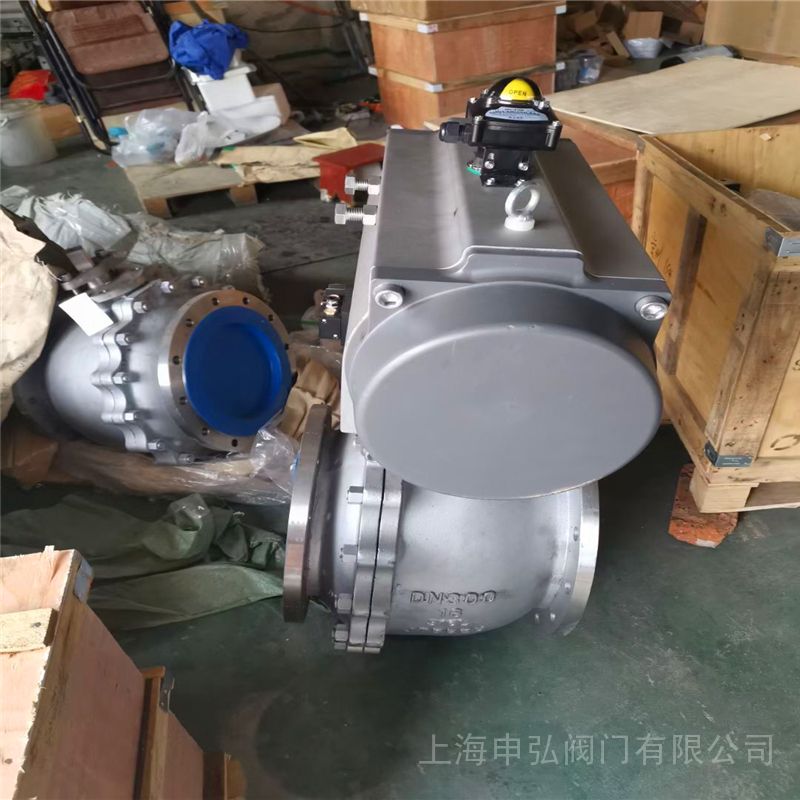 本实用新型的积极进步效果在于:本实用新型中的用于PTA的对夹包覆式放料球阀结构紧凑,避免了阀体的腔室中的缝隙,有效防止现有的球阀中发生余料残留在该缝隙处发生结晶的情况,提高球阀的使用寿命,并扩大了其适用范围。一种气动放料球阀本发明关于一种气动放料球阀。