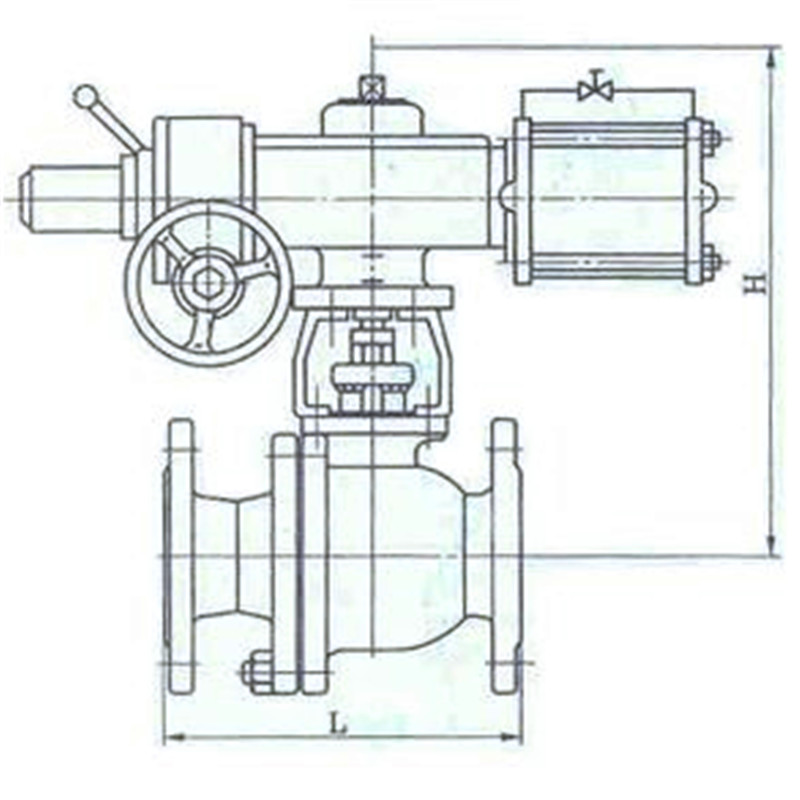 本实用新型的有益效果:上、下阀杆通过滑动轴承与阀体连接,摩擦系数小,启闭扭矩小,启闭灵活;阀体与阀座、阀盖、底盖连接处都通过耐热、抗氧化、耐油、耐腐蚀和耐大气老化的氟橡胶圈进行密封,阀体与阀杆之间通过性能稳定、耐热抗震的石墨密封,密封效果好;阀门传动为气动,启闭速度快。本领域内普通的技术人员简单替换和更换都是本专利保护范围之内。