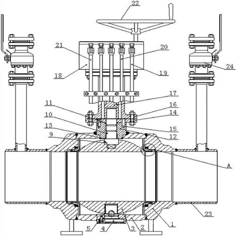 2、全焊接球阀的阀杆防飞结构:在阀杆下部设置台阶,从阀体内部下装阀杆,防止阀杆飞出。