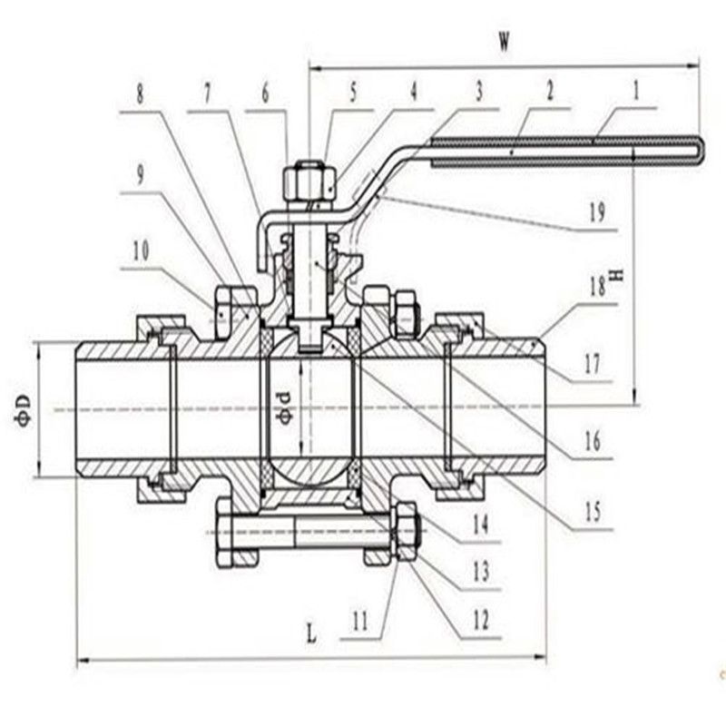 A105黑皮锻造焊接式球阀尺寸:序号 零件名称 材质 1 阀体 Body A105 A304 2 密封圈 Sealing Ring APTFE & PEEK 3 球体 Ball F6 F304 4 阀杆 Stem 410 304 5 O型圈 O-ring VITON 6 垫片 Gasket PTFE 7 螺栓 Bolt B7 B8 8 螺母 Nut 2H 8 9 薄型螺母 Flat nut 8 公称通径