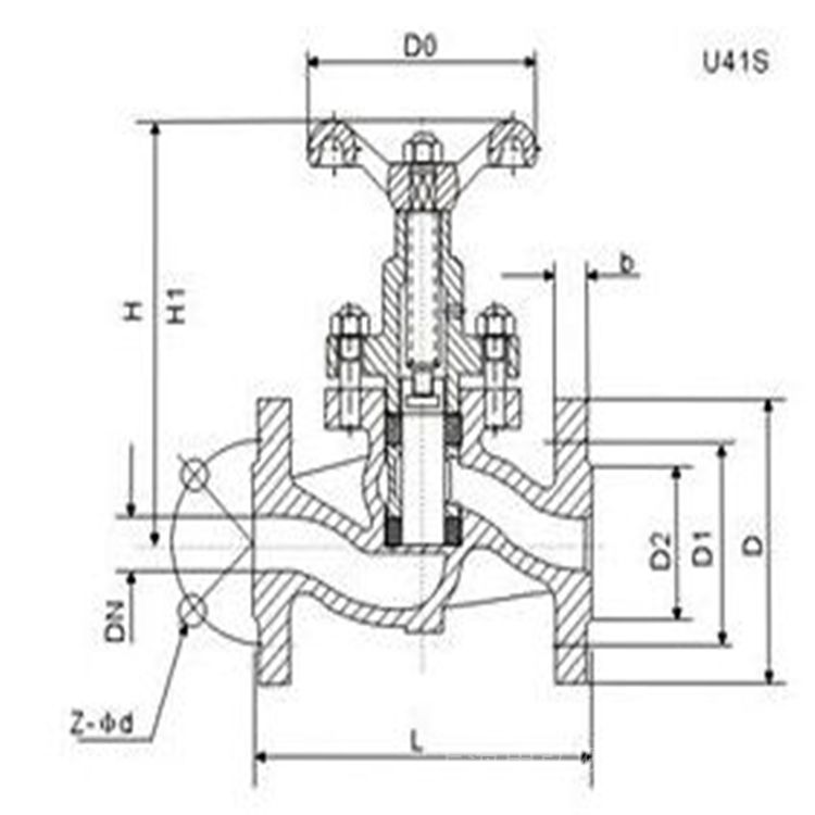 (mm)L 130 150 160 180 200 230 290 310 350 400 480 600 650 698 787 914 D 95 105 115 135 145 160 180 195 230 270 300 375 445 510 570 655 D1 65 75 85 100 110 125 145 160 190 220 250 320 385 450 515 585 D2 45 55 65 78 85 100 120 135 160 188 218 282 345 408 465 535 b 16 16 16 18 18 20 22 22 24 28 30 38 42 46 52 58 Z-?d 44 44 48 48 48 48 88 88 8-23 8-25 8-25 12-30 12-34 16-34 16-34 16-41 H 133 170 178 195 230 250 272 300 312 365 410 580 940 1000 1140 1400 重量 W 3.5 4.5 6 8 11 16 22 32 48 75 120 185 320 480 700 930 SUS304不锈钢柱塞阀主要外形尺寸6.4MPa