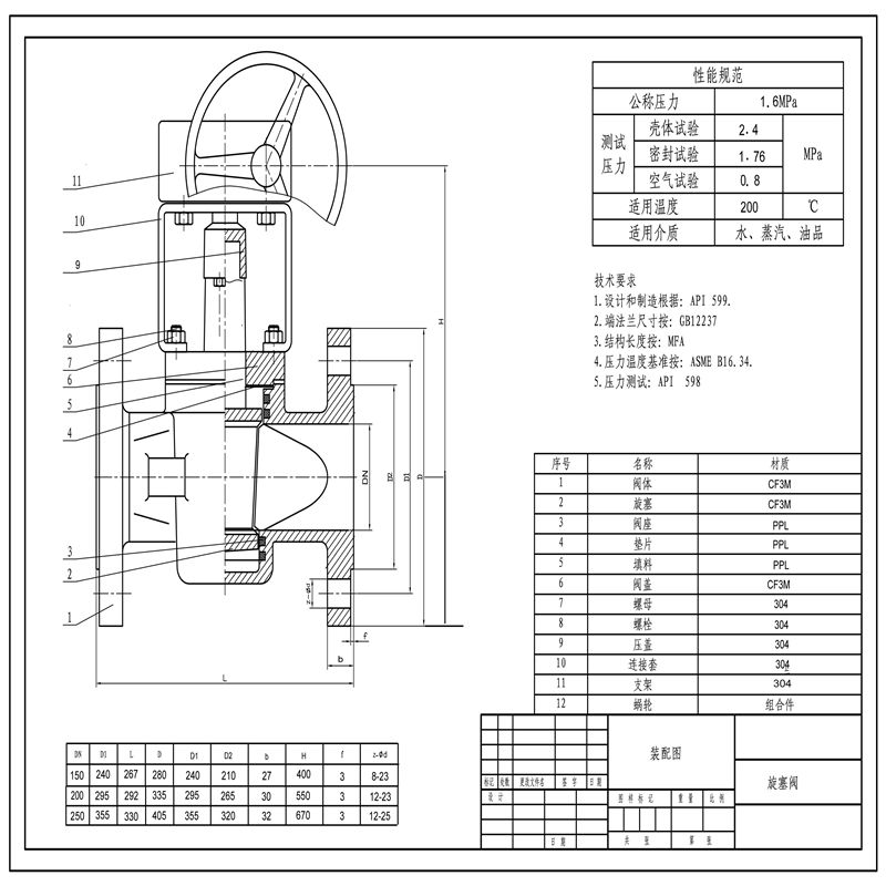 PN(MPa)试验压力PS(MPa) 适用介质 工作温度(℃) 壳体 密封 X943W-1.0C 1.0 1.5 1.1 煤气、油品 ≤200 X943W-1.0P 1.0 1.5 1.1 硝酸类 ≤250 X943W-1.0R 1.0 1.5 1.1 醋酸类 -20~150 四、X943W电动旋塞阀主要尺寸