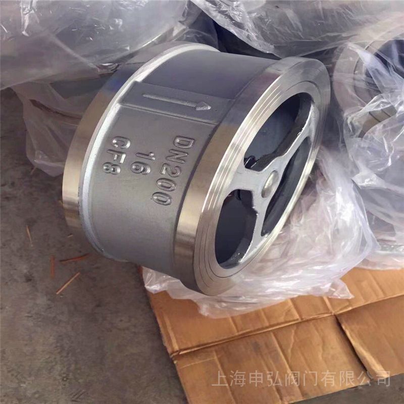 本发明涉及一种对夹升降式止回阀,具体的说是应用于输送蒸汽和空气介质的设备或管路上的对夹升降式止回阀,属于阀门类设备技术领域。是一种依靠介质压力开启和关闭的自动阀门。由于对夹式止回阀的结构长度比一般法兰式止回阀短,对有安装空间限制的场所为适用。对夹式止回阀具有结构长度短,体积小重量轻,阀瓣关闭快速,水锤压力小,流道通畅,流体阻力小,水平管道或垂直管道均可使用,安装方便,动作灵敏,密封性能好,阀瓣行程短、关阀冲击力小,简单紧凑、造型美观,使用寿命长、可靠性高,防止介质倒流,