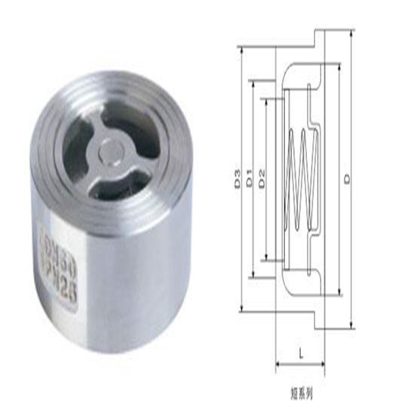 型号 公称通径 试验压力 工作温度 适用温度 壳体 密封 H71H-16Q 1.6 2.4 1.76 ≤235℃ 水、蒸气、油品等 H71H-25Q 2.5 3.75 2.75 ≤235℃ H71W-25H ≤300℃ H71W-25P ≤200℃ 硝酸等腐蚀性介质 H71W-40H 4.0 6.0 4.4 ≤300℃ H71W-40P ≤200℃ 水、蒸气 型号 阀门 阀瓣 弹簧 H71H-16Q H71H-25Q QT400-15 25 50CrVA H71W-25H H71W-40H 2Cr13 1Cr13 1Cr18Ni9 H71W-25P H71W-40P ZG1Cr18Ni9Ti 1Cr18Ni9Ti 1Cr18Ni9Ti 公称通径 DN(mm) L D 1.6 2.5 4.0 15 25 48 48 48 20 31.5 58 58 58 25 35.5 68 68 68 32 40 80 80 80 40 45 90 90 90 50 56 105 105 105 65 63 125 125 125 80 71 140 140 140 100 80 160 165 165 125 110 190 195 195 150 125 215 225 225 200 160 270 285 290 250 200 330 340 350 300 250 385 400 415 本发明结构简单、紧凑、合理,工作稳定可靠,耐磨耐高温;能够防止管路系统中介质导流,密封可靠,抗擦伤性能好,使用寿命长。本发明工作原理是:在工作时,当介质从介质进口流入时,在介质的压力作用下阀板打开,从介质出口流出。当流体从介质出口回流时,流体压力及阀板作用于阀座,将阀板压紧在阀座上,从而切断流动。
