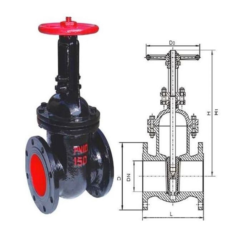 DN(mm)Z44T/W-10 L D H D0 40 165 145 295 160 50 180 160 325 180 65 195 180 380 180 80 210 195 420 200 100 230 215 520 200 125 255 245 610 240 150 280 280 710 240 200 330 335 915 320 250 380 390 1095 320 300 420 445 1275 400 350 450 500 1500 400 400 480 565 1760 500 450 510 615 1920 500 500 540 670 2170 720 600 600 780 - - 700 660 895 - - 800 720 1010 - - 900 780 1110 - - 1000 840 1220 - - 1200 960 1450 - - 本实用新型公开了一种电动铸铁明杆闸阀,包括阀体,阀体左侧连接有出水口、右侧连接有进水口,出水口、进水口均与阀体贯通连接,阀体顶部设有电机箱,电机箱内部设有电机,电机输出端设有蜗杆,本实用新型通过分别连接进水口和出水口,将阀体接入管路中,通过电机的转动,带动蜗杆,进而带动与蜗杆配合的蜗轮转动,蜗轮将动力通过转轴传递给主动齿轮,其中转轴贯穿电机箱左侧壁并与其配合,通过轴用弹性挡圈,控制转轴与电机箱左壁之间的相对位置,防止出现转轴在电机箱左侧壁窜动的问题,且二者之间涂有润滑脂,能够起到减少摩擦的作用,架构简单,合理紧凑,电动代替手动,效率明显提升。适用于工作温度为-29至425°C(碳钢)和 -29至500°C(不锈钢)的小口径管道。用于断开和连接管道。介质中的介质选自适用于水,蒸汽,油,硝酸盐,乙酸,氧化介质,尿素和其他介质的各种材料。广泛用于输油管道。