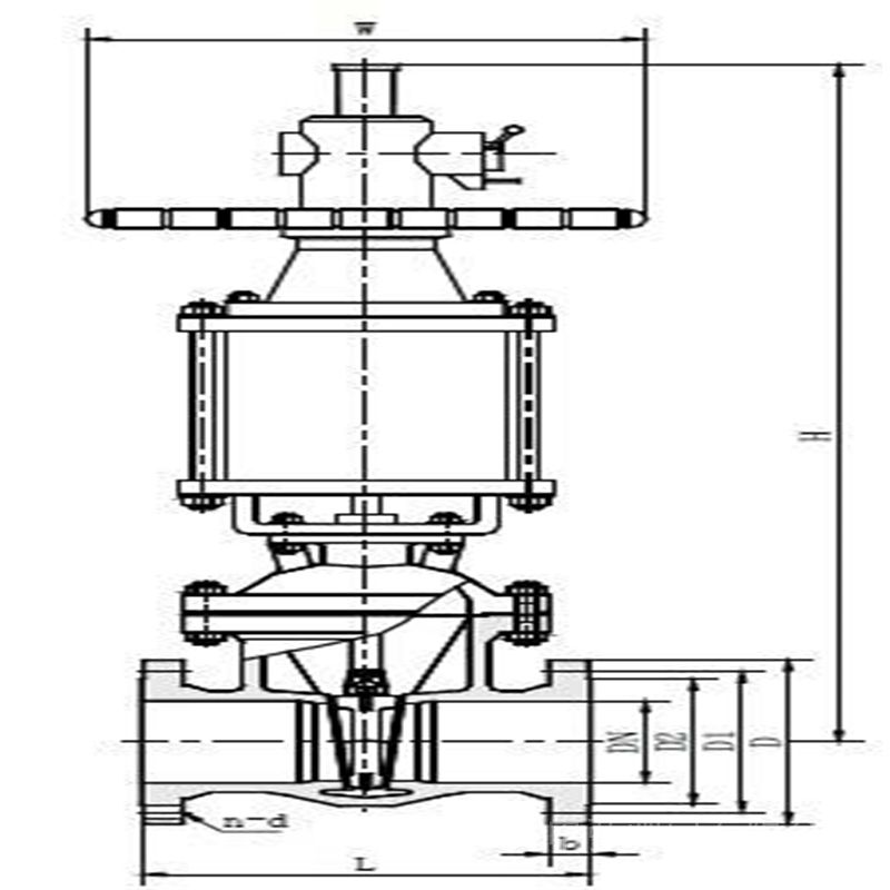 五、Z641F46气动波纹管衬氟闸阀 外型和连接尺寸公称通径 标准值 参考值 DN(mm) NPS(inch) L D D1 D2 f b Z-Фd W D0 H WT(Kg) PN0.6MPa 15 1/2 130 80 55 40 2 12 4-Ф12 100 100 120 5 20 3/4 150 90 65 50 2 14 4-Ф12 100 120 140 6 25 1 160 100 75 60 2 14 4-Ф12 120 130 150 7 32 11/4 180 120 90 70 2 16 4-Ф14 120 156 185 10 40 11/2 240 130 100 80 3 16 4-Ф14 160 165 205 18 50 2 250 140 110 90 3 16 4-Ф14 160 350 400 25 65 21/2 270 160 130 110 3 16 4-Ф14 180 370 435 30 80 3 280 185 150 125 3 18 4-Ф18 180 430 510 43 100 4 300 205 170 145 3 18 4-Ф18 220 495 595 58 125 5 325 235 200 175 3 20 8-Ф18 220 610 735 100 150 6 350 260 225 200 3 20 8-Ф18 240 670 820 115 200 8 400 315 280 255 3 22 8-Ф18 240 815 1015 145 250 10 450 370 335 310 3 24 12-Ф18 240 965 1215 230 300 12 500 435 395 362 4 24 12-Ф23 280 1140 1440 335 350 14 550 485 445 412 4 26 12-Ф23 280 1275 1625 540 400 16 600 535 495 462 4 28 16-Ф23 320 1445 1845 670 450 18 650 590 550 518 4 28 16-Ф23 320 1530 1980 780 500 20 700 640 600 568 4 30 16-Ф23 360 1725 2225 850