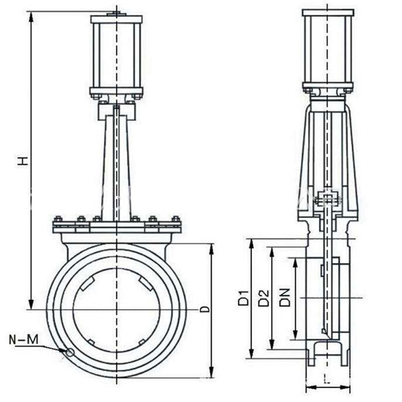 主要外形及连接尺寸Profile and connection dimension 单位Unit:mm PN DN L D D1 D2 H N-M PN DN L D D1 D2 H N-M 0.6 50 48 160 125 100 335 4-16 1.0 50 48 160 125 99 335 4-16 65 48 180 145 120 363 4-16 65 48 185 145 120 363 4-16 80 50 195 160 135 395 4-16 80 50 200 160 135 395 8-16 100 50 215 180 155 465 8-16 100 50 220 180 155 465 8-16 125 57 245 210 185 530 8-16 125 57 250 210 185 530 8-16 150 57 280 240 210 630 8-20 150 57 285 240 210 630 8-20 200 70 335 295 265 750 8-20 200 70 340 295 265 750 12-20 250 70 390 350 320 900 12-20 250 70 405 355 310 900 12-22 300 76 440 400 368 1125 12-20 300 76 460 410 375 1125 12-22 350 76 500 460 428 1260 16-20 350 76 520 470 435 1260 16-22 400 89 565 515 482 1450 16-22 400 89 580 525 485 1450 16-27 450 89 615 565 532 1600 20-22 450 89 640 585 545 1600 20-27 500 114 670 620 585 1820 20-22 500 114 715 650 609 1820 20-30 600 114 780 725 685 2300 20-27 600 114 840 770 720 2300 20-36 700 130 895 840 800 2600 24-27 700 130 910 840 788 2600 24-36 800 130 1010 950 898 3000 24-30 800 130 1025 950 895 3000 24-36 900 140 1110 1050 1005 3400 28-30 900 140 1125 1050 998 3400 28-36 1000 216 1220 1160 1115 3800 28-30 1000 216 1255 1170 1110 3800 28-42 1200 254 1450 1380 1325 4300 32-36 1200 254 1485 1390 1325 4300 32-48 本实用新型公开了一种新型气动刀闸阀,包括架体、导轨、刀闸、调整螺栓、调整板、*气缸、第二气缸、导向轴、丝杠、手轮、卸料口,所述架体上设置有卸料口,所述卸料口下方设置有调整板,所述调整板通过调整螺栓固定在架体上,所述调整板上设置有导轨,所述导轨上设置有刀闸,所述刀闸尾端与*气缸连接,所述*气缸的尾端与第二气缸的尾端连接,所述第二气缸与导向轴固定连接,所述导向轴的一端与架体连接,所述导向轴上设置有丝杠,所述丝杠的尾端设置有手轮。本实用新型该一种新型气动刀闸阀具有卸料口调节方便、结构简单、实用等特点。