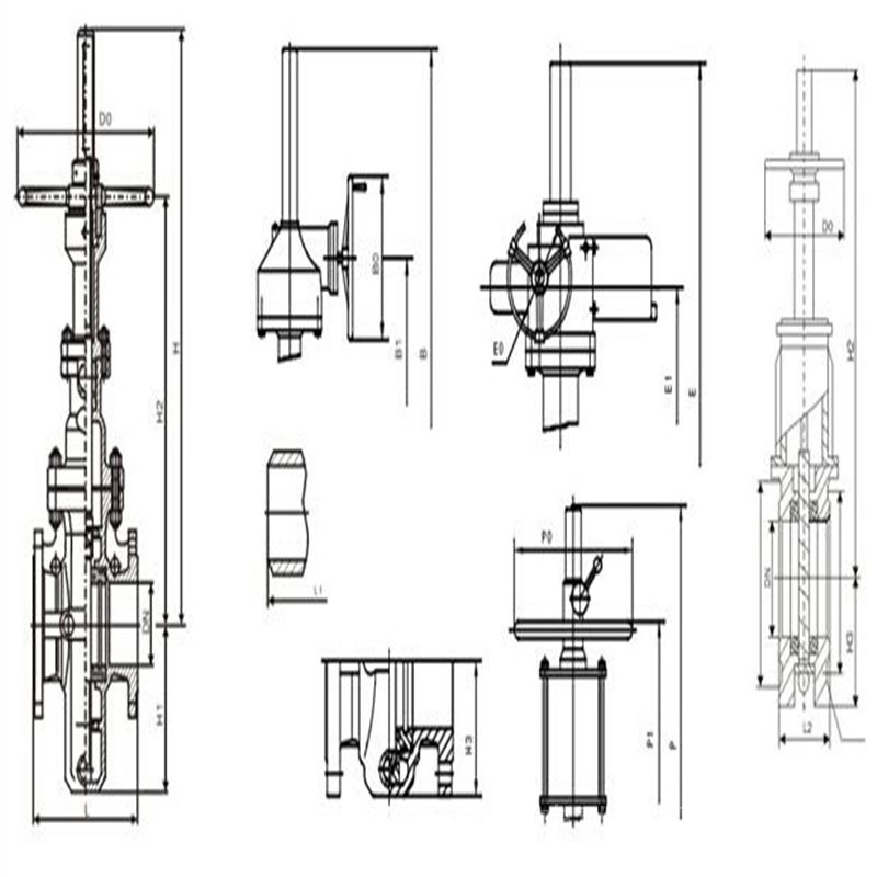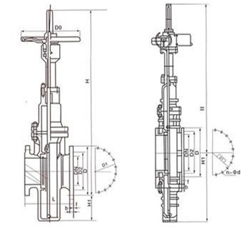 公称压力PN(MPa) 公称通径DN(mm) 外形尺寸(mm) L D D1 D2 Dn b f Z-Φd H H1 DO 2.5 50 178 160 125 100 49 20 3 4-18 380 1 10 180 65 190 180 145 120 64 22 3 8-18 390 135 180 80 203 1 95 160 135 76 22 3 8-18 490 160 200 100 229 230 190 160 96 24 3 8-23 560 190 250 125 254 270 220 188 120 28 3 8-25 660 230 250 150 267 300 250 218 146 30 3 8-25 760 267 250 200 292 360 310 278 202 34 3 12-25 950 345 300 250 330 425 370 332 250 36 3 12-30 1 150 420 300 300 356 485 430 390 300 40 4 16-30 1335 495 350 350 381 550 490 448 337 44 4 16-34 1520 571 350 400 406 610 550 505 387 48 d 16-34 1690 650 400 450 450 660 600 555 438 50 4 20-34 1880 725 450 500 457 730 660 610 489 52 4 20-41 2060 800 450 600 508 840 770 718 591 56 5 20-41 2405 951 500 700 610 955 875 815 692 60 5 24-48 2760 1005 550 800 660 1070 990 930 781 64 5 24-48 3120 1260 600