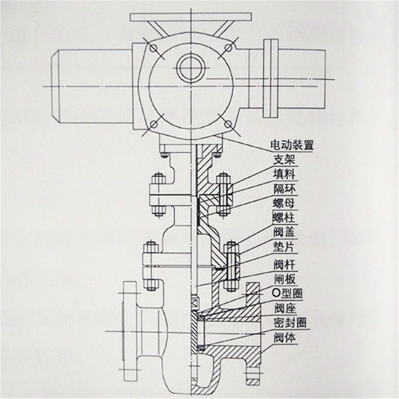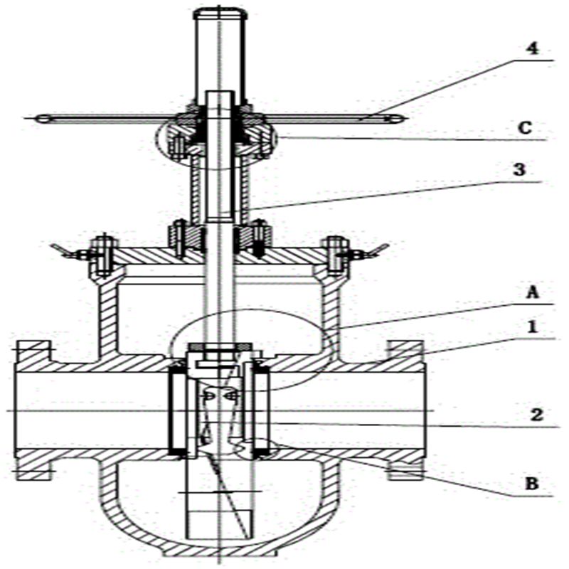 (K)Z944WF-2565 190 180 145 120 300 3 22 634 8-Φ18 80 203 195 160 135 350 3 22, 388 8-Φ18 100 229 230 190 160 350 3 24 863 8-Φ23 125 254 270 220 188, 350 3 28 940 8-Φ25 150 267 300 250 218 400 3 30 1030 8-Φ25 200 292 360 310 278 450 3 34 1277 12-Φ25 250 330 425 370 332 500 3 36 1491 12-Φ30 300 356 485 430 390 305 4 40 1701 16-Φ30 350 381 550 490 448 305 4 44 1875 16-Φ34 400 406 610 550 505 305 4 48 2180 16-Φ34 450 432 660 600 555 305 4 50 2440 20-Φ34 500 457 730 660 610 305 4 52 2860 20-Φ41 600 508 840 770 718 305 5 56 3450 20-Φ41 700 610 955 875 815 305 5 60 3960 24-Φ48 800 660 1070 990 930 305 5 64 4550 24-Φ48 900 711 1180 1090 1025 - 5 66 5250 28-Φ54 1000 811 1305 1210 1140 - 5 68 5870 28-Φ48 本实用新型的技术方案包括阀体、阀盖、闸板、阀杆,阀体内腔制有与闸板相互配合的密封面,闸板由左闸板和右闸板组成;主要是左闸板和右闸板采用两个半环相扣连接在一起,左闸板和右闸板的两个半环之间制有缺口,该缺口位于阀杆中心线垂直方向,其中一侧闸板上的缺口弧度大于另一侧闸板上的半环弧度;在左闸板和右闸板的上端面沿两闸板结合面方向安装定位块,该定位块由阀杆压装在左闸板和右闸板的上端面。