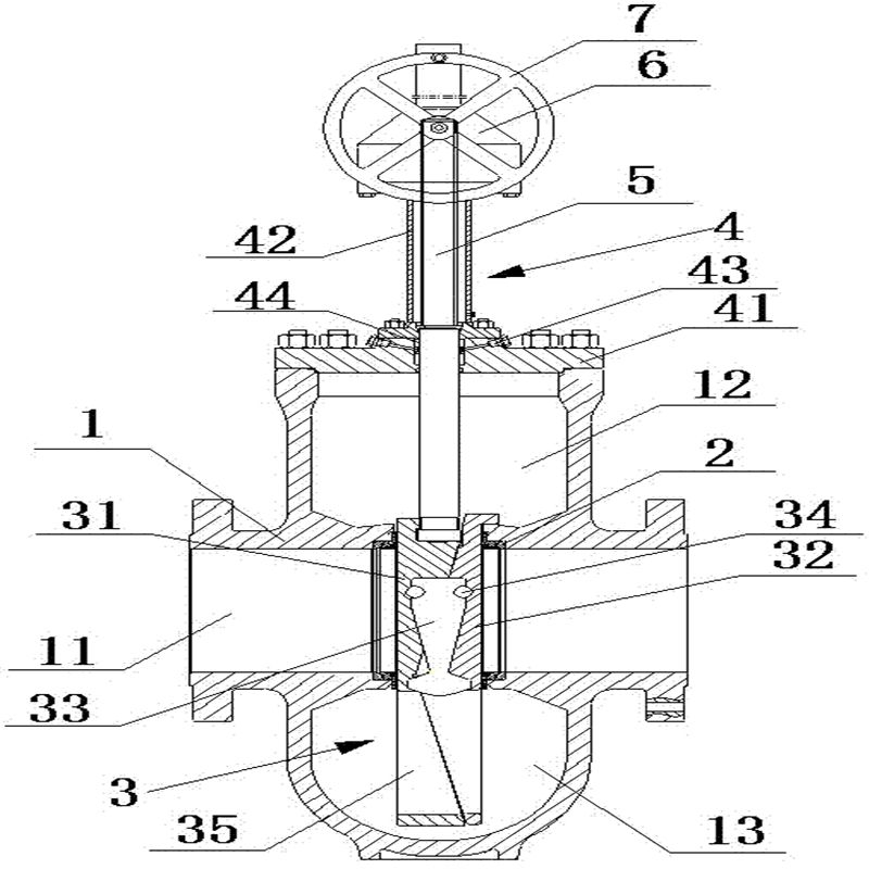 本实用新型的目的在于,提供一种密封补偿、使用寿命长的膨胀式双闸板平板闸阀。上述结构利用*闸板和第二闸板的曲面或斜面的拼接,并通过闸板锁臂进行活动连接,那么当*闸板下压的时候,利用曲面或斜面就能挤压第二闸板,使闸板挤压两侧的密封材料,即使密封材料有磨损,由于两闸板之间的作用,就能实现密封力的补偿,可以使闸板保持长时间的稳定密封,从使闸阀的使用寿命延长。本实用新型属于阀门领域,特别涉及一种闸阀。适用于天然气开采和净化的长输管线。