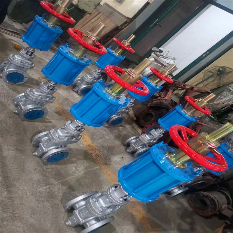 4、气缸盖上部装有气动-手动转换装置。将转换手柄顺时针方向提转到“气动”定位孔定位,闸阀处于气动操作状态;反之,将转换手柄逆时针方向提转到“手动”定于孔处定位,闸阀即可进行手动操作。带锥齿轮的手柄转换方向相反。 手动操作闸阀时,手轮旋向和普通手动阀一样,即顺时针转为关,逆时针转为开。带锥齿轮转动的相反。