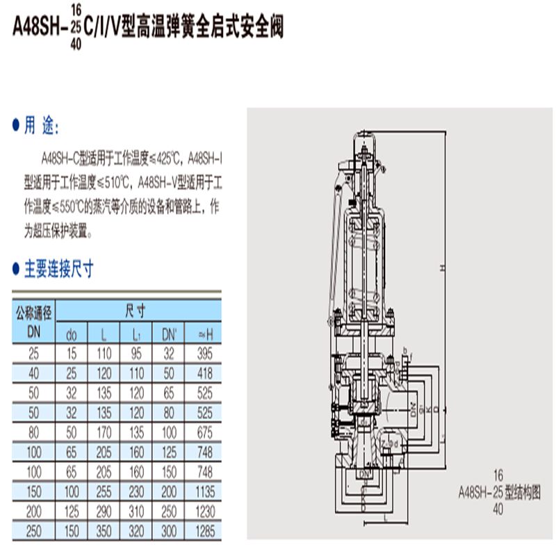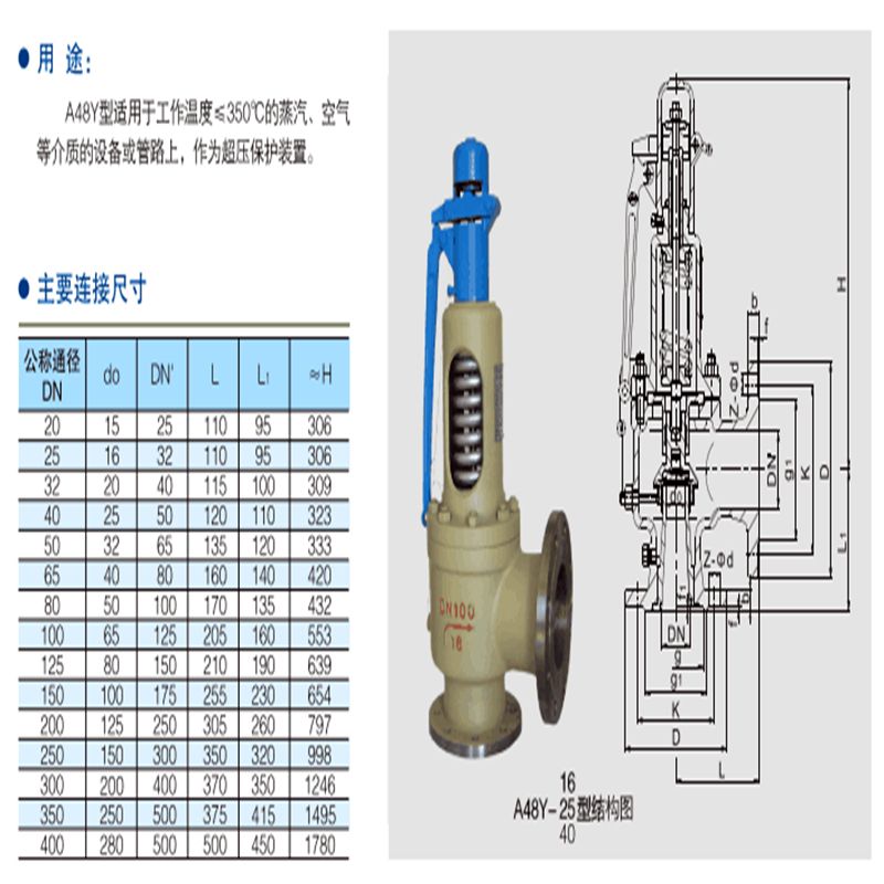 适用于工作温度≤300℃空气、石油气、液体等介质的设备和管路上。A42Y-P型及A42Y-R型适用于工作温度≤200℃有腐蚀性的介质的设备和管路上,作为超压保护装置。