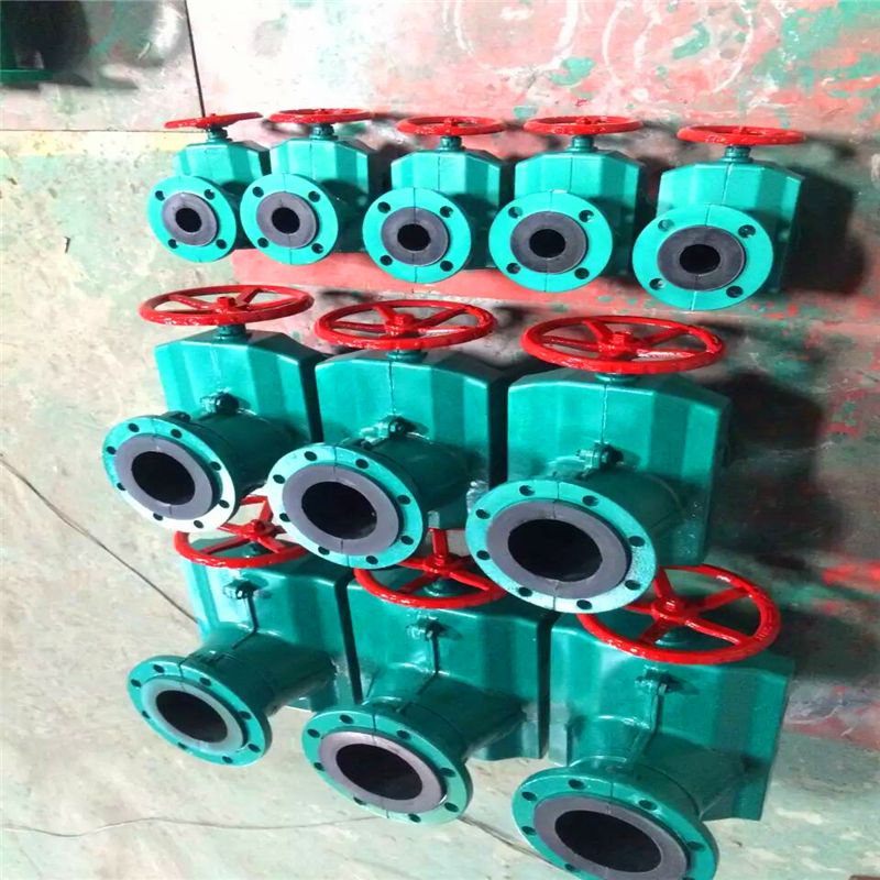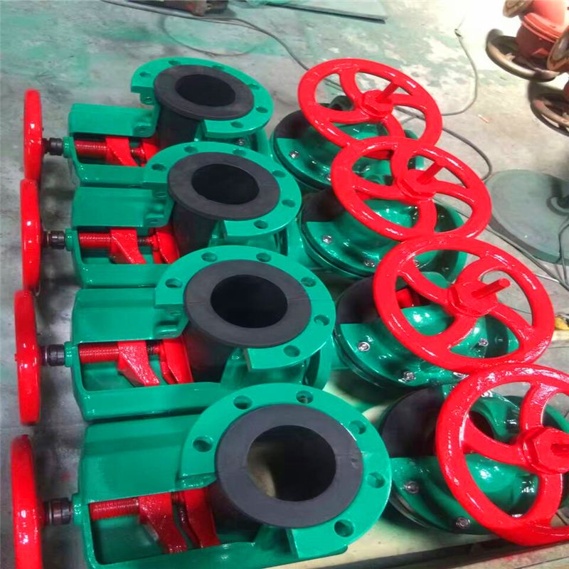 由左右铝合金阀体,橡胶管套、大小阀杆、上下闸板、导柱等零件组成。耐磨、防腐、抗冻、密封性能好,只须更换胶套即完好,阀体可较长时间使用。驱动方式有手动、气动、电动等多种方式,也可按客户需求定制非标产品。