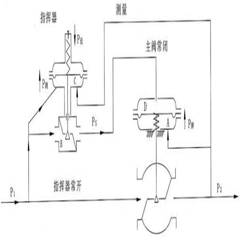 1.本实用新型无需外加能源,利用被调介质本身压力变化而实现自动调节,使阀后压力恒定,整机具有动作灵敏,控制压力波动小,节约能源等特点。本实用新型属于自力式阀门系列,利用介质自身的压力来控制阀门开关,采用先导式结构,有两个薄膜执行机构(指挥器检测机构和主阀检测机构各一个),阀后压力不直接控制主阀芯,而是指挥器执行机构控制阀门主阀的开和关。