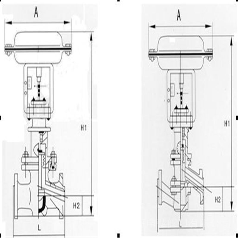 阀体、阀盖 ZG230-450衬F46 阀座、阀芯 304衬F46 阀杆 304衬F46 导向套 304衬F46 波纹管 不锈钢+F46 ZJHF气动薄膜衬四氟调节阀外形结构图