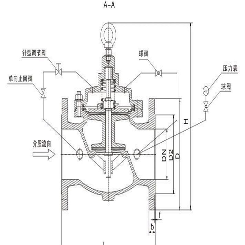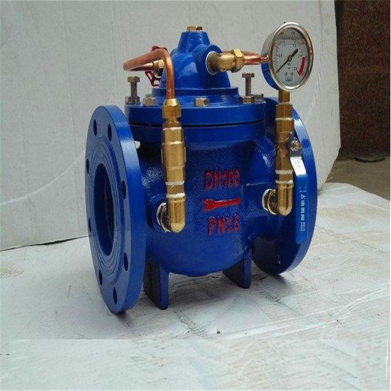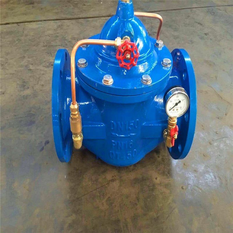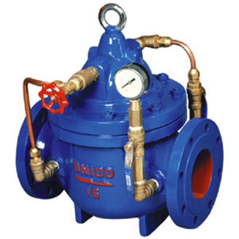 当阀门从进口端给水时,水通过微型过滤器、针阀、单向阀进入主阀控制室,再经过球阀排水至下游。因为针阀开度小于球阀开度,即主阀控制室的排水速度大于进水速度,因此控制室压力降低,作用于主阀盘下端的进口压力打开主阀向下游供水。