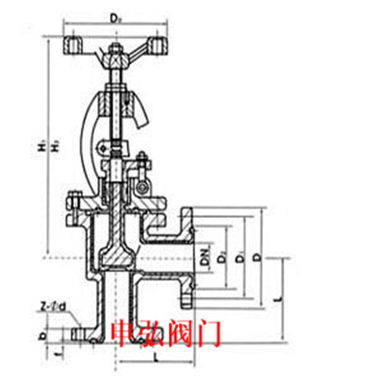 DN in L D D1 D2 f b z-φd Do H1 H2 W 15 1/2 65/90 95 65 45 2 16 4-φ14 120 245 270 7.5 20 3/4 75/95 105 75 55 2 16 4-φ14 120 250 275 8.8 25 1 80/100 115 85 65 2 16 4-φ14 140 260 290 11 32 21/4 95/105 135 100 78 2 18 4-φ18 140 290 325 13 40 21/2 100/115 145 110 85 3 18 4-φ18 160 300 335 18 50 2 115/125 160 125 100 3 20 4-φ18 180 355 400 31 65 21/2 145 180 145 120 3 22 8-φ18 220 400 450 39 80 3 155 195 160 135 3 22 8-φ18 280 450 495 50 100 4 175 230 190 160 3 24 8-φ23 320 530 590 60 125 5 200 270 220 188 3 28 8-φ25 380 600 650 75 150 6 240/225 300 250 218 3 30 8-φ25 400 650 770 98 200 8 275 360 310 278 3 34 12-φ23 450 700 850 170 电动角式截止阀只适用于全开和全关,不适用作调节和节流。该阀属于强制密封式阀门,所以在阀门关闭时,必须向阀瓣施加压力,以强制密封面不 泄漏。当介质由阀瓣下方进入阀门时,操作力所需克服的阻力,是阀杆和填料的摩擦力与由介质的压力 所产生的推力,关电动角式截止阀 的力比开电动角式截止阀的力大,所以阀杆的直径要大,否则会发生阀杆顶弯的故障。