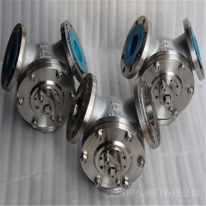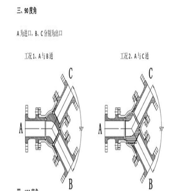1、Y型三通球阀有相互成120°和两通孔成135°,根据需要可实现对介质流向切换两种工况。