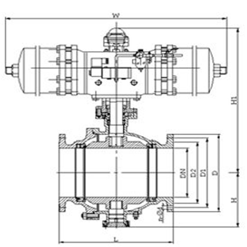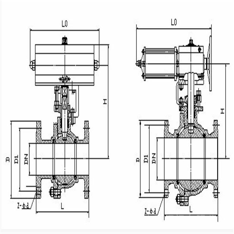 阀 体球体、阀杆阀 座WCB2Cr13加玻纤增强聚四氟乙烯、对位聚苯ZG1Cr18Ni9Ti1Cr18Ni9TiCF80Cr19Ni9-(304)CF300Cr19Ni11-(304L)ZG1Cr18Ni-12Mo2Ti1Cr18Ni12-Mo2TiCF8M0Cr17Ni12-Mo2(316)CF3M00Cr17Ni14-Mo2(316l)气动固定式球阀是新一代高性能球阀,适用于长输管线和一般工业管线,其强度、安全性、耐恶劣环境性等在设计时进行了特殊考虑,适用于各种腐蚀性和非腐蚀性介质。它与浮动球阀相比,工作时,阀前流体压力在球体上产生的作用力全部传递给轴承,不会使球体向阀座移动,因而阀座变形小,密封性能稳定、使用寿命长,适用于高压、大口径场合。阀门安装如果不符合要求,会造成工作不正常或出现故障。反之,安装得当,不仅能够保证正常使用,还可延长阀门使用寿命,减少维修工作量和获得良好的控制性能。PN1.0(MPa)通径(DN)Ld1DD1D2bZ-dH重量125356125245210185228-1854290150394150280240210228-23572130200457200335295265248-236362032505332503903503202612-237262453006103004404003682612-238593993506863505004604282616-239274984007624005655154822616-2510808184508644506155655322820-251120103750091450067062058528