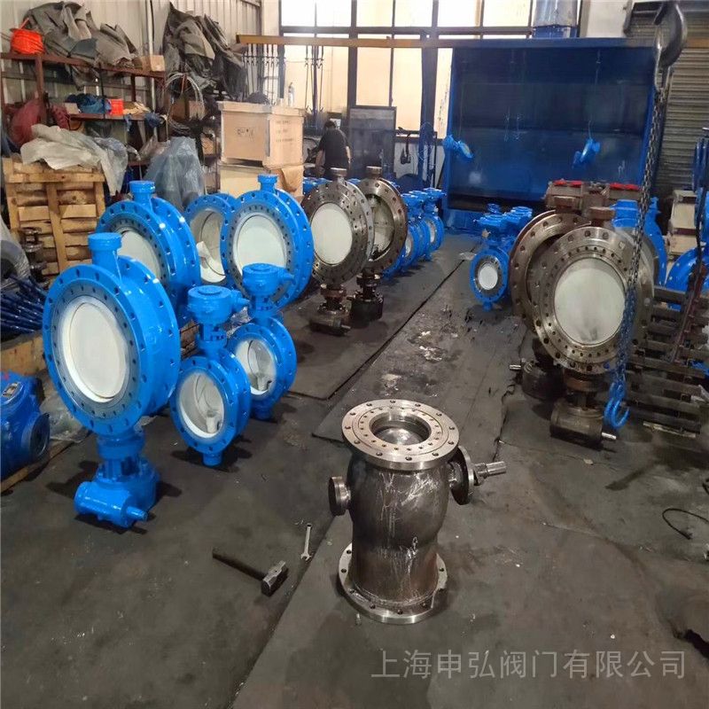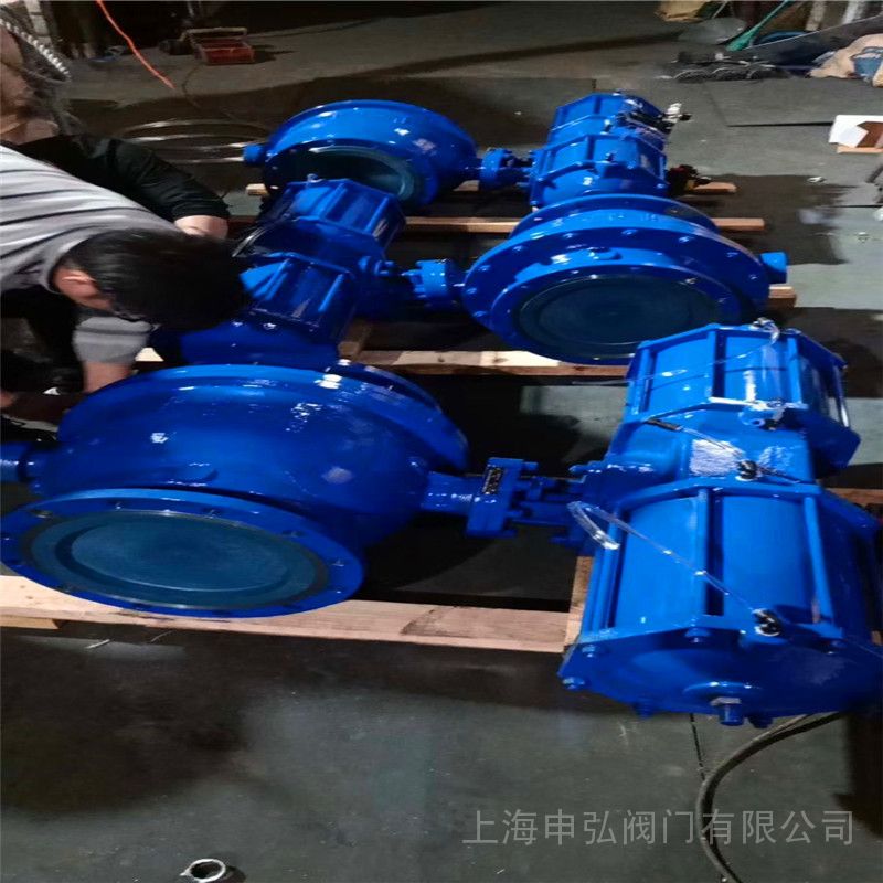 本实用新型的有益效果:上、下阀杆通过滑动轴承与阀体连接,摩擦系数小,启闭扭矩小,启闭灵活;阀体与阀座、阀盖、底盖连接处都通过耐热、抗氧化、耐油、耐腐蚀和耐大气老化的氟橡胶圈进行密封,阀体与阀杆之间通过性能稳定、耐热抗震的石墨密封,密封效果好;阀门传动为气动,启闭速度快。